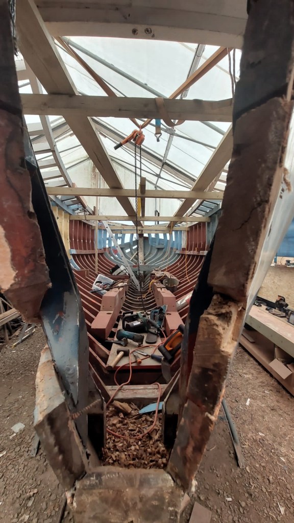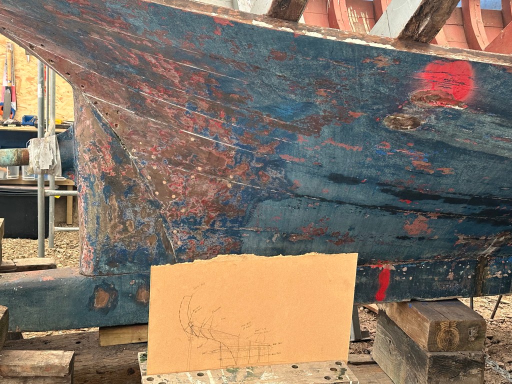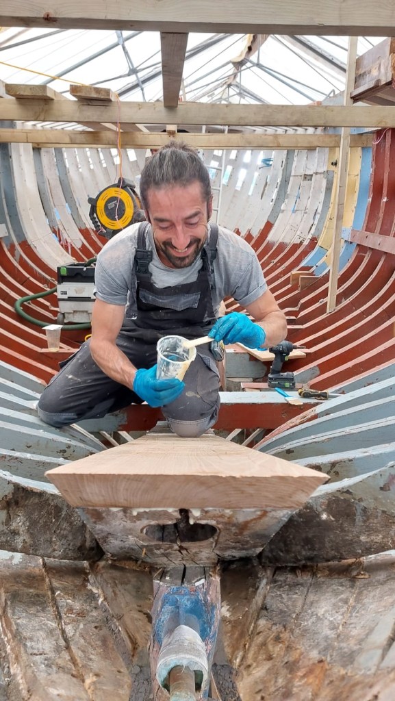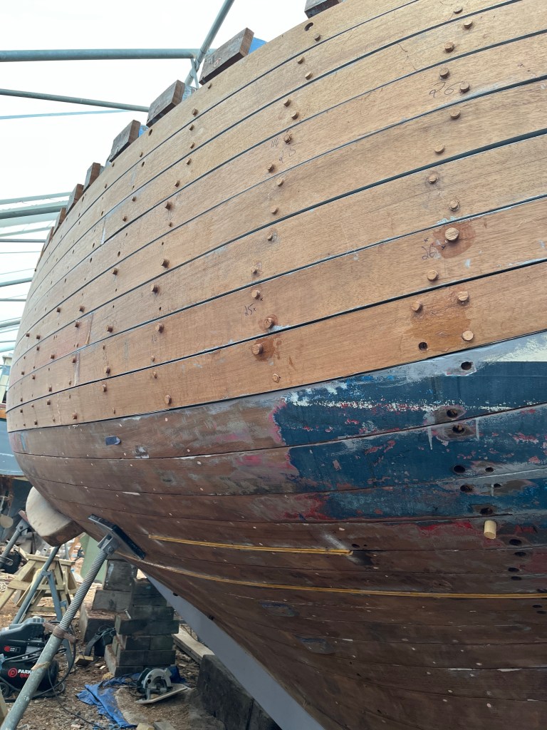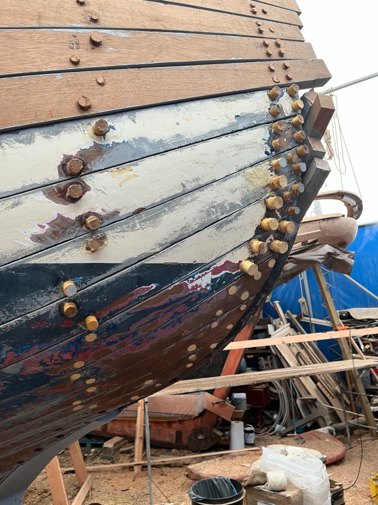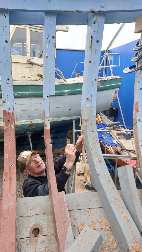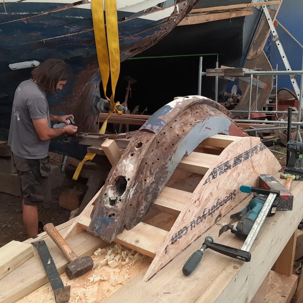Pure art… isn’t that a beautiful stern?Caulking commences..One more plank to go!L’David fitting the first deck beams before working on the carlings …. Min 500mm around walk way.New waterline The classic vessel and design inspiration Engine repositioning aft…Sailing RigWhere shall I sleep? Reminder of the original build Port side planked up now..The planks are in two sections from 6m and 5m stock. A template is splined from the hull drawn on the stock which is cut out and the edges faired for a tight fit and bevel for caulking.James is working by himself now and getting a plank completed in 2-3 days These aft stern planks are steamed in.Preparing and fairing the frames… L’David back for October… a great opportunity to explore the coastal pubs of the Lizard!This plank had to be replaced again as the scarf needed to be further backJames Pardoe joined the permanent team in October working with L’David.Forward plank scarfed and srew fastenedFirst starboard plank completed and steamed in bag for 2hrs by L’David The 30’ planking arrives… shipwright L’David back on site..Some wider 6m planks arrivingPlanking being ripped from the Iroka treeFrames and centreline repainting by “Dot”L’David’s stern knee The new stem being fitted by SimonAn extensive and deep keel repair with half repaired internally retaining the port face and the starboard side infilled with Iroka.The first plugs fitted to the keel bolt holes.. for plug manufacture see Tool Box section.The keel and hull is being primed with an aluminium underwater wood primerSome say this is a “new build “!Boring the rudder post1/2” Oak laminate for capping the stern post I’m doing most of the frame replacement Sean…Volunteer!A lot of the original apron chunks are from oak sections which have conflicting grain and there are two long through bolts holding it all together. Big cracks on the apron face are original and we will router out a deep face to strengthen the apron before a massive 9’ long knee is laminated to hold it all together.L’David making a template for an apron lamination.It fits!Taking out the apron knee – perhaps this was added as an after thought?The Stern knee showing signs of rotThe steam and stern are winched together moving the knees internally some 10mmWe’re in good wood now..The Stem laminated from OakWe’ve bought a tree from the Congo..ethnically felled Iroka etc and planked 30’ l x 34”w x 1 5/8” thickSo here we go..!Built in the late 1960s Rosey was the largest boat built at the Cove’s shipyard and the last I believe.She was built by Edgar Cove in Salcombe Devon and launched in 1970. Built on a massive Oak backbone, frame and timber construction and planked with 1” Iroka..weighing approximately 12 ton.This is pretty much her original build condition, definitely not an effective sailing vessel but a very good steamer at 6knots, 1100rpm, 1 gal/hr come “hell or high water”!Ex works Wollgast N Germany following an extensive refit in 1998.John F Yeoman left, myself middle and Ken Painter my Dad on the right in 1985. John sadly died two years later and I lost my mentor and along with my father a great friend who supported my education in the Army before starting a 25 year career at Foster Yeoman.