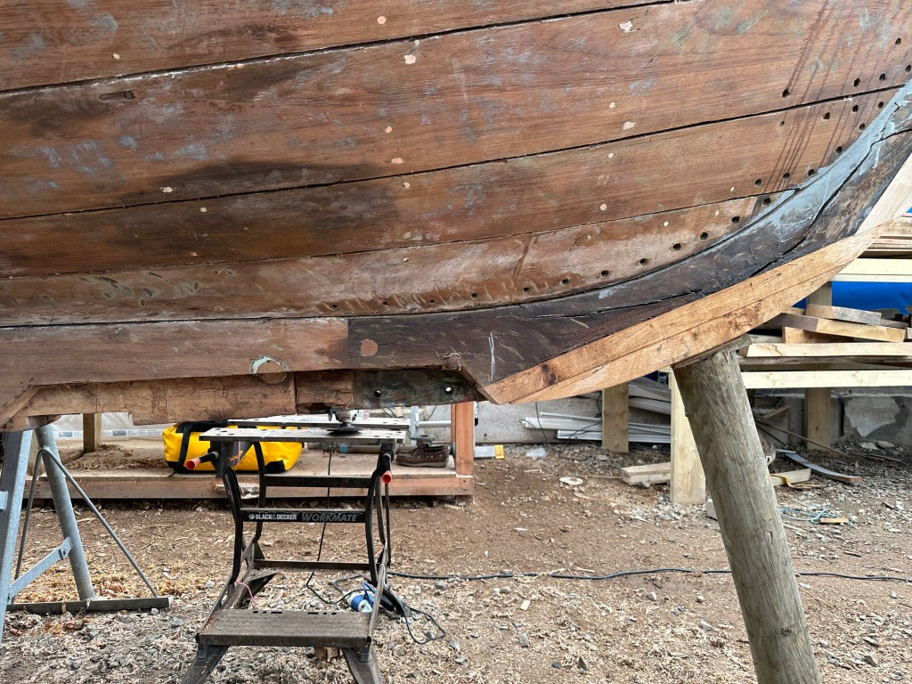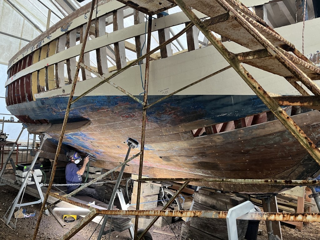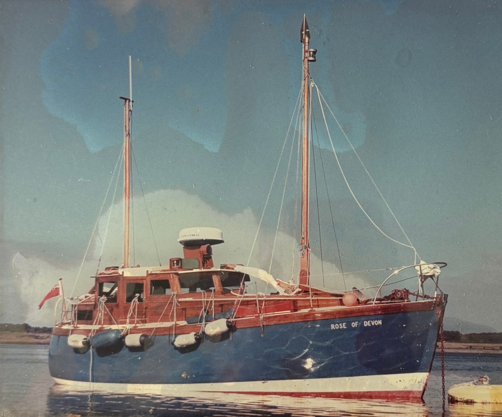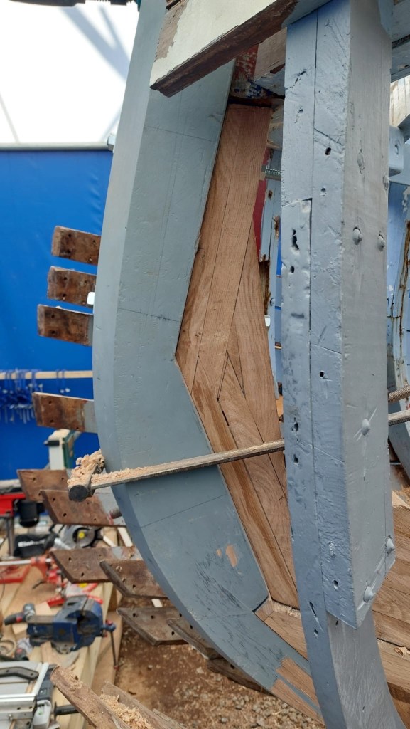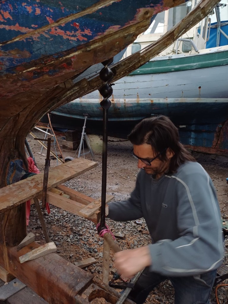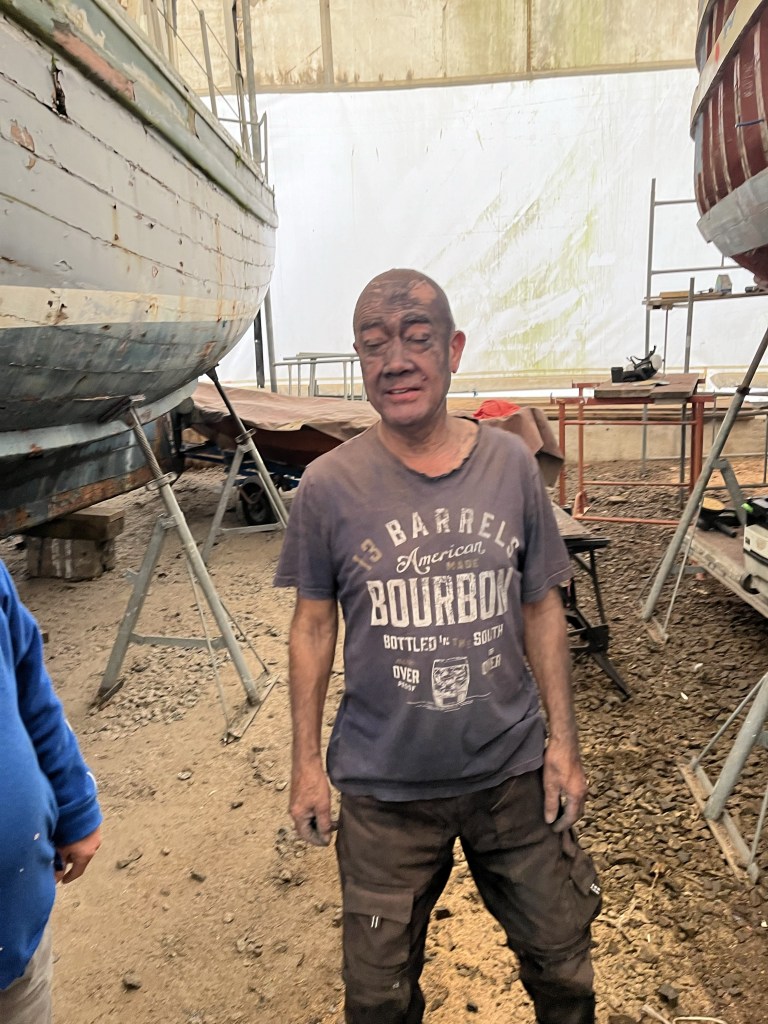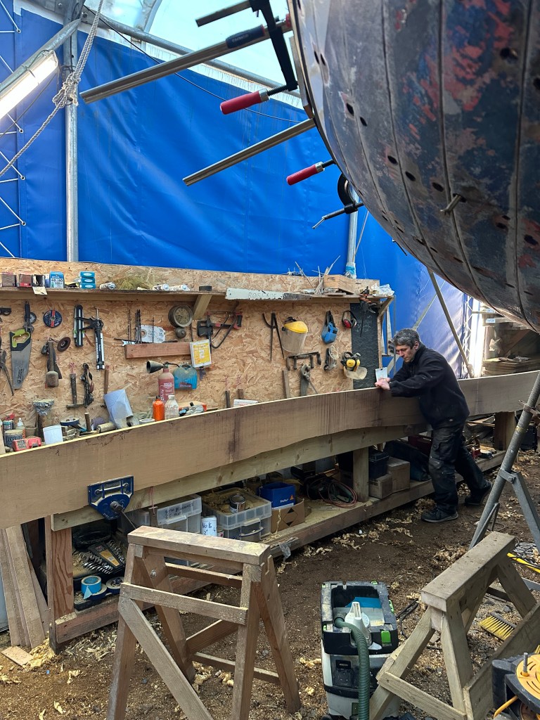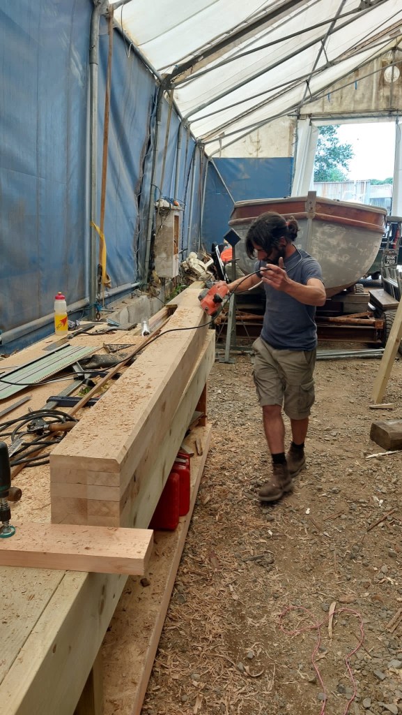 Pure art… isn’t that a beautiful stern?Caulking commences..One more plank to go!L’David fitting the first deck beams before working on the carlings …. Min 500mm around walk way.New waterline The classic vessel and design inspiration Engine repositioning aft…Sailing RigWhere shall I sleep? Reminder of the original build Port side planked up now..The planks are in two sections from 6m and 5m stock. A template is splined from the hull drawn on the stock which is cut out and the edges faired for a tight fit and bevel for caulking.James is working by himself now and getting a plank completed in 2-3 days These aft stern planks are steamed in.Preparing and fairing the frames… L’David back for October… a great opportunity to explore the coastal pubs of the Lizard!This plank had to be replaced again as the scarf needed to be further backJames Pardoe joined the permanent team in October working with L’David.Forward plank scarfed and srew fastenedFirst starboard plank completed and steamed in bag for 2hrs by L’David The 30’ planking arrives… shipwright L’David back on site..Some wider 6m planks arrivingPlanking being ripped from the Iroka treeFrames and centreline repainting by “Dot”L’David’s stern knee The new stem being fitted by SimonAn extensive and deep keel repair with half repaired internally retaining the port face and the starboard side infilled with Iroka.The first plugs fitted to the keel bolt holes.. for plug manufacture see Tool Box section.The keel and hull is being primed with an aluminium underwater wood primerSome say this is a “new build “!Boring the rudder post1/2” Oak laminate for capping the stern post I’m doing most of the frame replacement Sean…Volunteer!A lot of the original apron chunks are from oak sections which have conflicting grain and there are two long through bolts holding it all together. Big cracks on the apron face are original and we will router out a deep face to strengthen the apron before a massive 9’ long knee is laminated to hold it all together.L’David making a template for an apron lamination.It fits!Taking out the apron knee – perhaps this was added as an after thought?The Stern knee showing signs of rotThe steam and stern are winched together moving the knees internally some 10mmWe’re in good wood now..The Stem laminated from OakWe’ve bought a tree from the Congo..ethnically felled Iroka etc and planked 30’ l x 34”w x 1 5/8” thickSo here we go..!Built in the late 1960s Rosey was the largest boat built at the Cove’s shipyard and the last I believe.She was built by Edgar Cove in Salcombe Devon and launched in 1970. Built on a massive Oak backbone, frame and timber construction and planked with 1” Iroka..weighing approximately 12 ton.This is pretty much her original build condition, definitely not an effective sailing vessel but a very good steamer at 6knots, 1100rpm, 1 gal/hr come “hell or high water”!Ex works Wollgast N Germany following an extensive refit in 1998.John F Yeoman left, myself middle and Ken Painter my Dad on the right in 1985. John sadly died two years later and I lost my mentor and along with my father a great friend who supported my education in the Army before starting a 25 year career at Foster Yeoman.