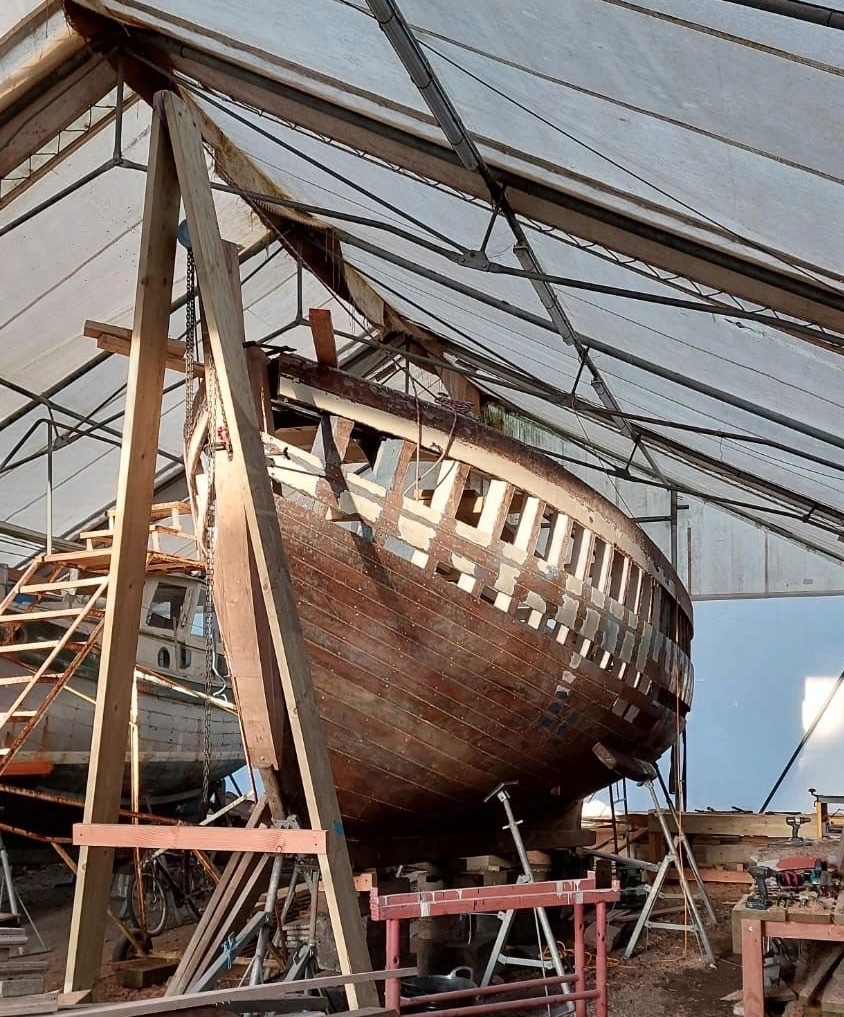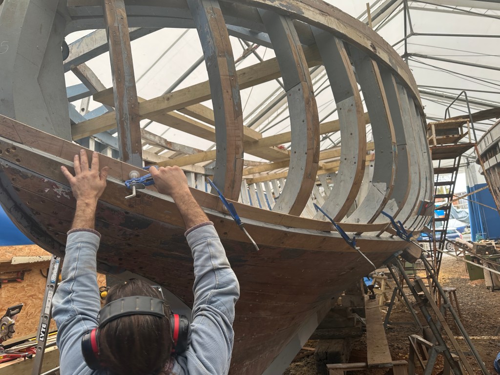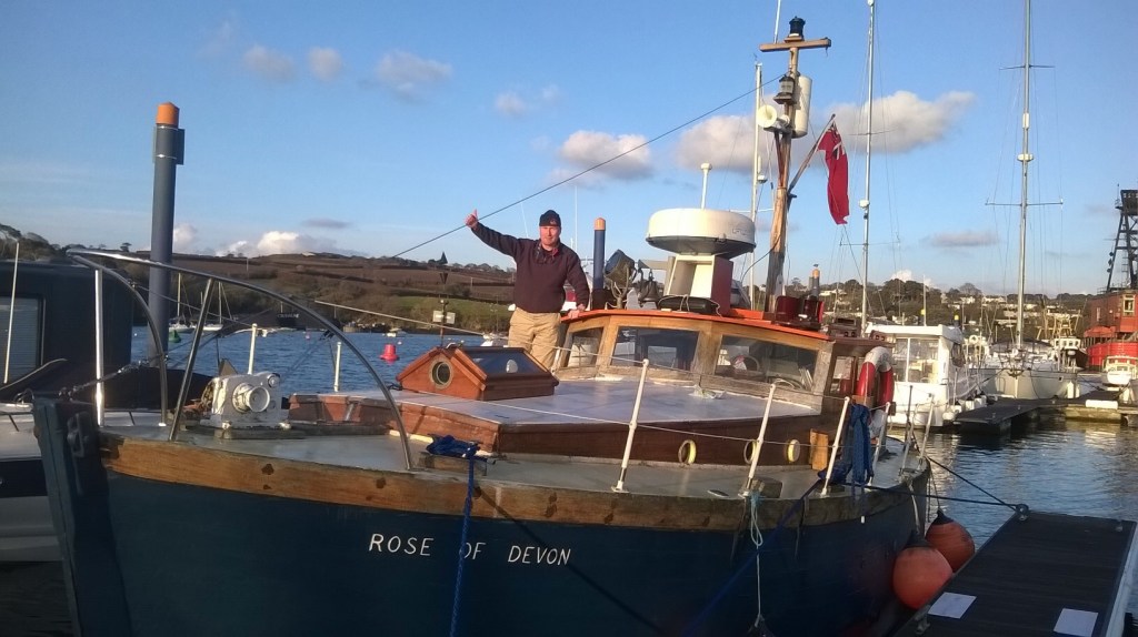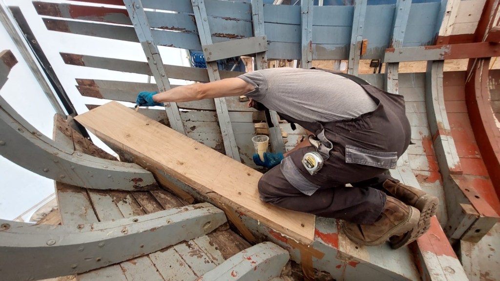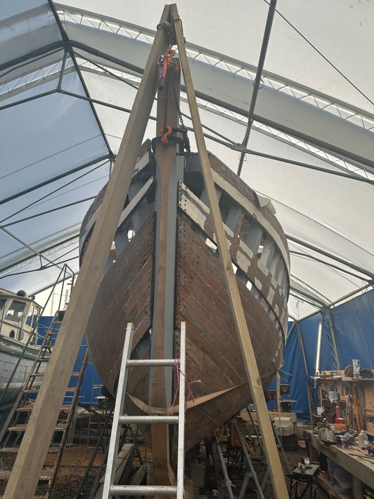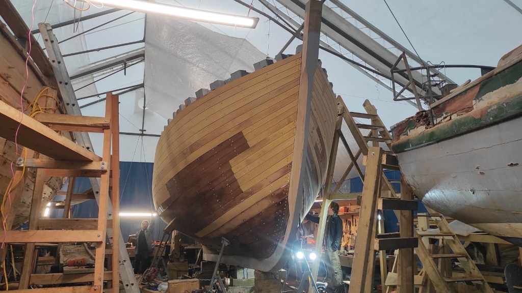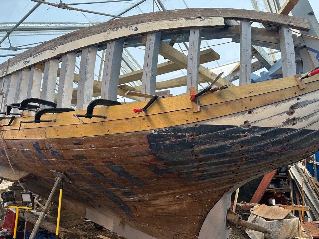Pure art… isn’t that a beautiful stern?Caulking commences..One more plank to go!L’David fitting the first deck beams before working on the carlings …. Min 500mm around walk way.New waterline The classic vessel and design inspiration Engine repositioning aft…Sailing RigWhere shall I sleep? Reminder of the original build Port side planked up now..The planks are in two sections from 6m and 5m stock. A template is splined from the hull drawn on the stock which is cut out and the edges faired for a tight fit and bevel for caulking.James is working by himself now and getting a plank completed in 2-3 days These aft stern planks are steamed in.Preparing and fairing the frames… L’David back for October… a great opportunity to explore the coastal pubs of the Lizard!This plank had to be replaced again as the scarf needed to be further backJames Pardoe joined the permanent team in October working with L’David.Forward plank scarfed and srew fastenedFirst starboard plank completed and steamed in bag for 2hrs by L’David The 30’ planking arrives… shipwright L’David back on site..Some wider 6m planks arrivingPlanking being ripped from the Iroka treeFrames and centreline repainting by “Dot”L’David’s stern knee The new stem being fitted by SimonAn extensive and deep keel repair with half repaired internally retaining the port face and the starboard side infilled with Iroka.The first plugs fitted to the keel bolt holes.. for plug manufacture see Tool Box section.The keel and hull is being primed with an aluminium underwater wood primerSome say this is a “new build “!Boring the rudder post1/2” Oak laminate for capping the stern post I’m doing most of the frame replacement Sean…Volunteer!A lot of the original apron chunks are from oak sections which have conflicting grain and there are two long through bolts holding it all together. Big cracks on the apron face are original and we will router out a deep face to strengthen the apron before a massive 9’ long knee is laminated to hold it all together.L’David making a template for an apron lamination.It fits!Taking out the apron knee – perhaps this was added as an after thought?The Stern knee showing signs of rotThe steam and stern are winched together moving the knees internally some 10mmWe’re in good wood now..The Stem laminated from OakWe’ve bought a tree from the Congo..ethnically felled Iroka etc and planked 30’ l x 34”w x 1 5/8” thickSo here we go..!Built in the late 1960s Rosey was the largest boat built at the Cove’s shipyard and the last I believe.She was built by Edgar Cove in Salcombe Devon and launched in 1970. Built on a massive Oak backbone, frame and timber construction and planked with 1” Iroka..weighing approximately 12 ton.This is pretty much her original build condition, definitely not an effective sailing vessel but a very good steamer at 6knots, 1100rpm, 1 gal/hr come “hell or high water”!Ex works Wollgast N Germany following an extensive refit in 1998.John F Yeoman left, myself middle and Ken Painter my Dad on the right in 1985. John sadly died two years later and I lost my mentor and along with my father a great friend who supported my education in the Army before starting a 25 year career at Foster Yeoman.