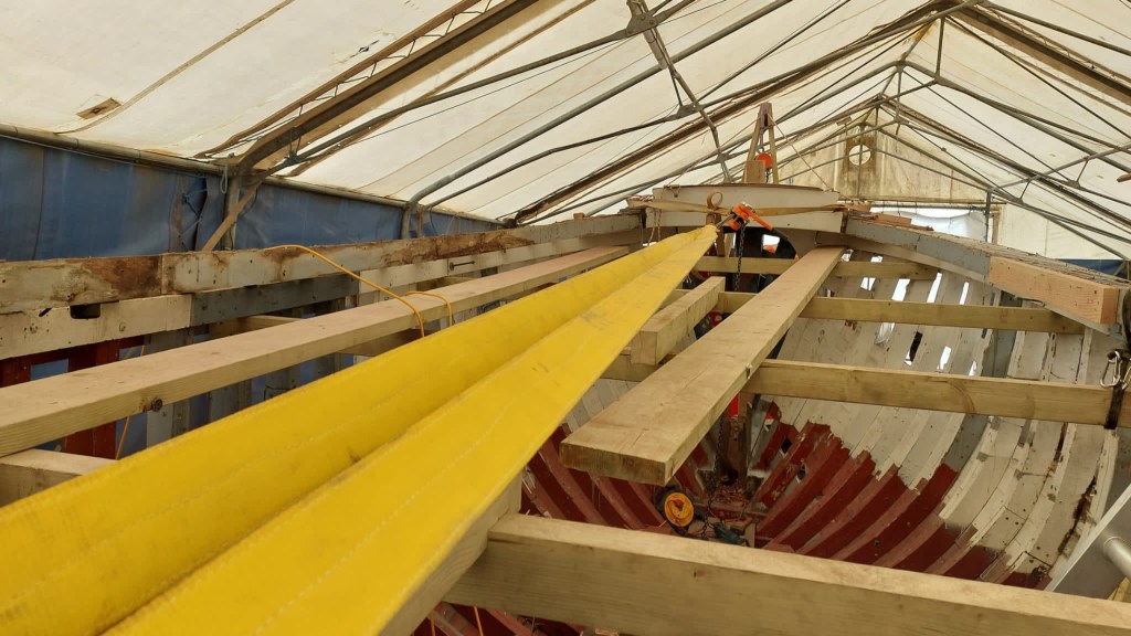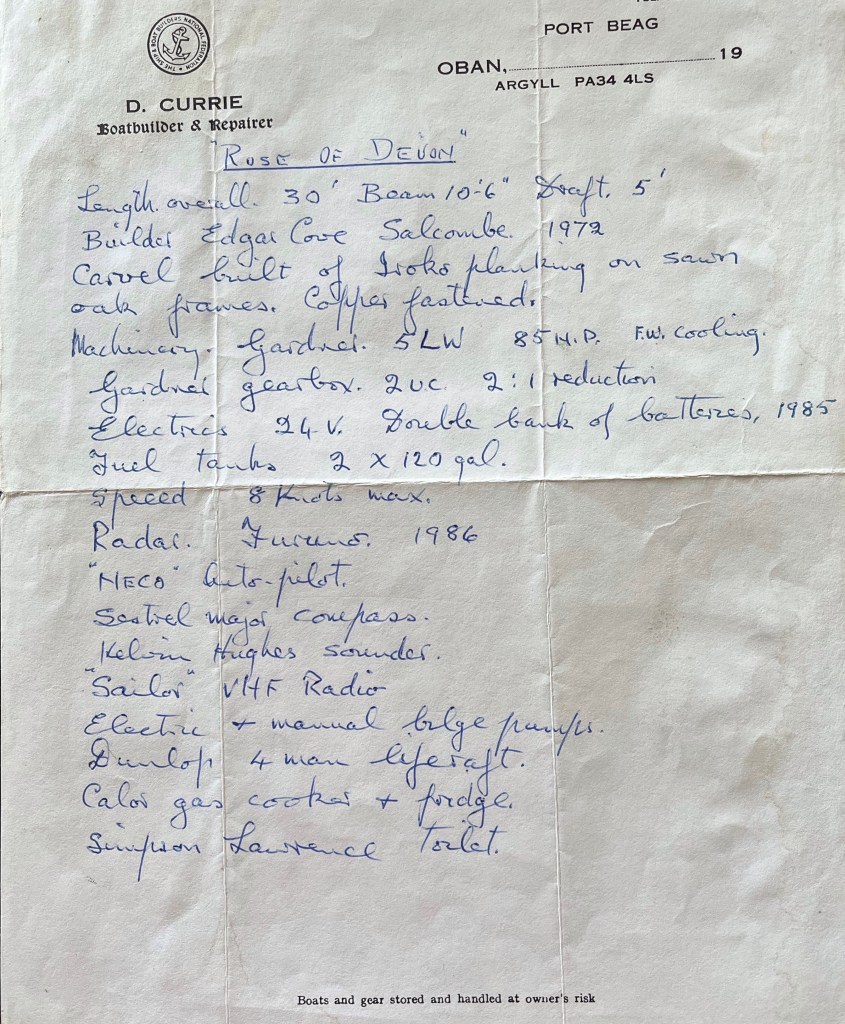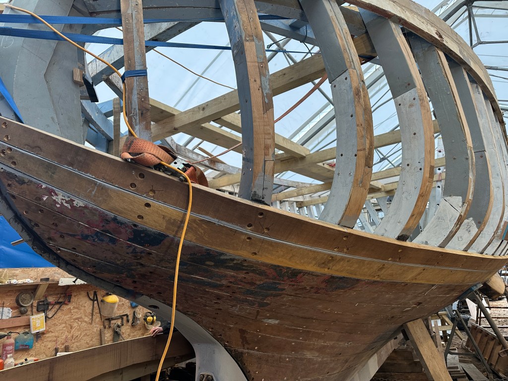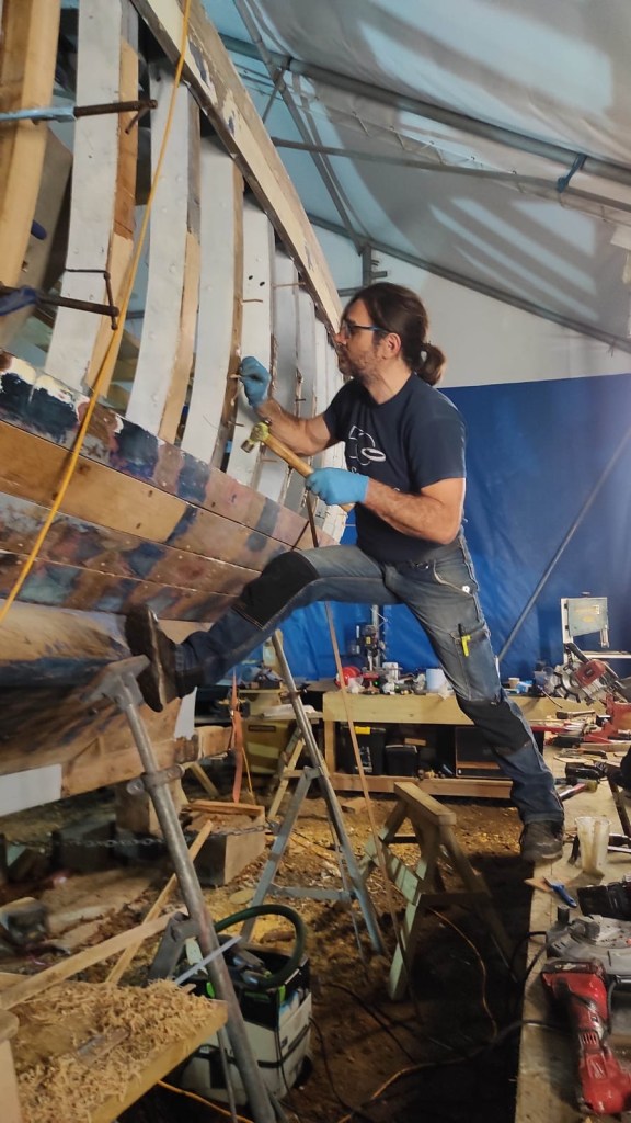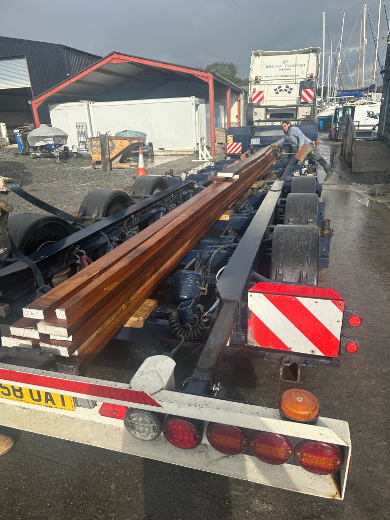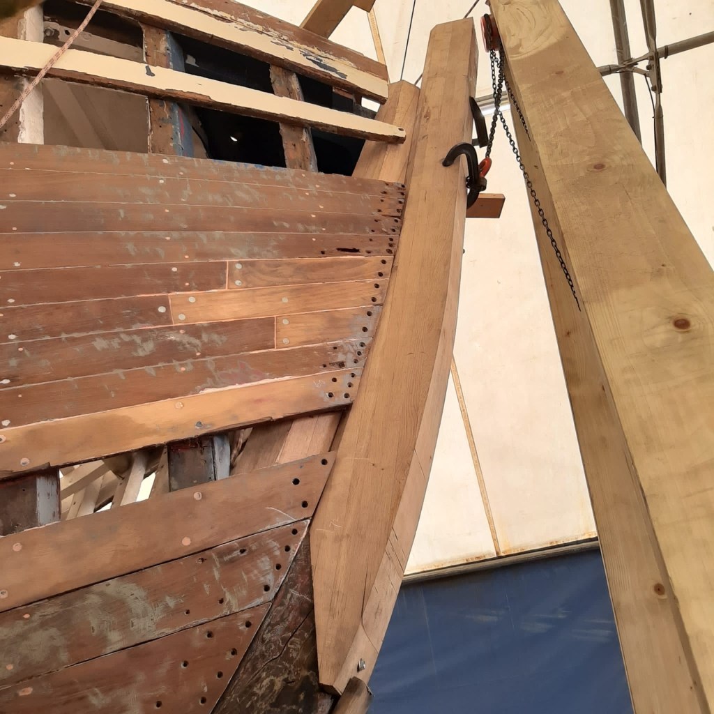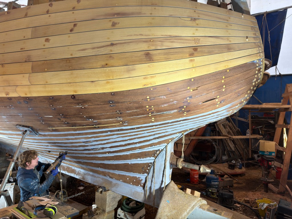 Pure art… isn’t that a beautiful stern?Caulking commences..One more plank to go!L’David fitting the first deck beams before working on the carlings …. Min 500mm around walk way.New waterline The classic vessel and design inspiration Engine repositioning aft…Sailing RigWhere shall I sleep? Reminder of the original build Port side planked up now..The planks are in two sections from 6m and 5m stock. A template is splined from the hull drawn on the stock which is cut out and the edges faired for a tight fit and bevel for caulking.James is working by himself now and getting a plank completed in 2-3 days These aft stern planks are steamed in.Preparing and fairing the frames… L’David back for October… a great opportunity to explore the coastal pubs of the Lizard!This plank had to be replaced again as the scarf needed to be further backJames Pardoe joined the permanent team in October working with L’David.Forward plank scarfed and srew fastenedFirst starboard plank completed and steamed in bag for 2hrs by L’David The 30’ planking arrives… shipwright L’David back on site..Some wider 6m planks arrivingPlanking being ripped from the Iroka treeFrames and centreline repainting by “Dot”L’David’s stern knee The new stem being fitted by SimonAn extensive and deep keel repair with half repaired internally retaining the port face and the starboard side infilled with Iroka.The first plugs fitted to the keel bolt holes.. for plug manufacture see Tool Box section.The keel and hull is being primed with an aluminium underwater wood primerSome say this is a “new build “!Boring the rudder post1/2” Oak laminate for capping the stern post I’m doing most of the frame replacement Sean…Volunteer!A lot of the original apron chunks are from oak sections which have conflicting grain and there are two long through bolts holding it all together. Big cracks on the apron face are original and we will router out a deep face to strengthen the apron before a massive 9’ long knee is laminated to hold it all together.L’David making a template for an apron lamination.It fits!Taking out the apron knee – perhaps this was added as an after thought?The Stern knee showing signs of rotThe steam and stern are winched together moving the knees internally some 10mmWe’re in good wood now..The Stem laminated from OakWe’ve bought a tree from the Congo..ethnically felled Iroka etc and planked 30’ l x 34”w x 1 5/8” thickSo here we go..!Built in the late 1960s Rosey was the largest boat built at the Cove’s shipyard and the last I believe.She was built by Edgar Cove in Salcombe Devon and launched in 1970. Built on a massive Oak backbone, frame and timber construction and planked with 1” Iroka..weighing approximately 12 ton.This is pretty much her original build condition, definitely not an effective sailing vessel but a very good steamer at 6knots, 1100rpm, 1 gal/hr come “hell or high water”!Ex works Wollgast N Germany following an extensive refit in 1998.John F Yeoman left, myself middle and Ken Painter my Dad on the right in 1985. John sadly died two years later and I lost my mentor and along with my father a great friend who supported my education in the Army before starting a 25 year career at Foster Yeoman.