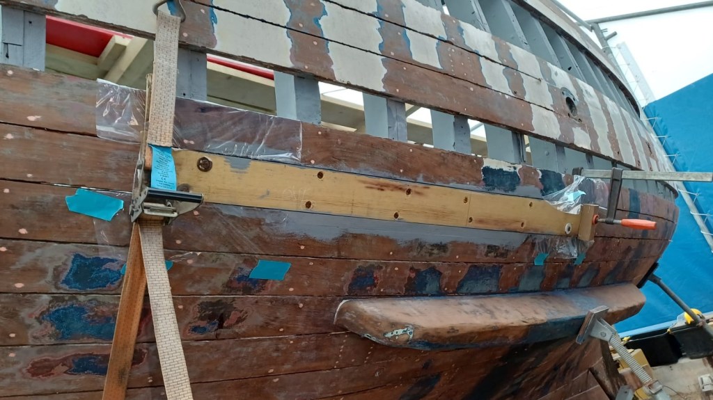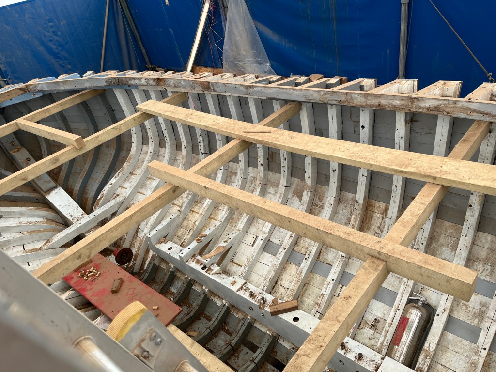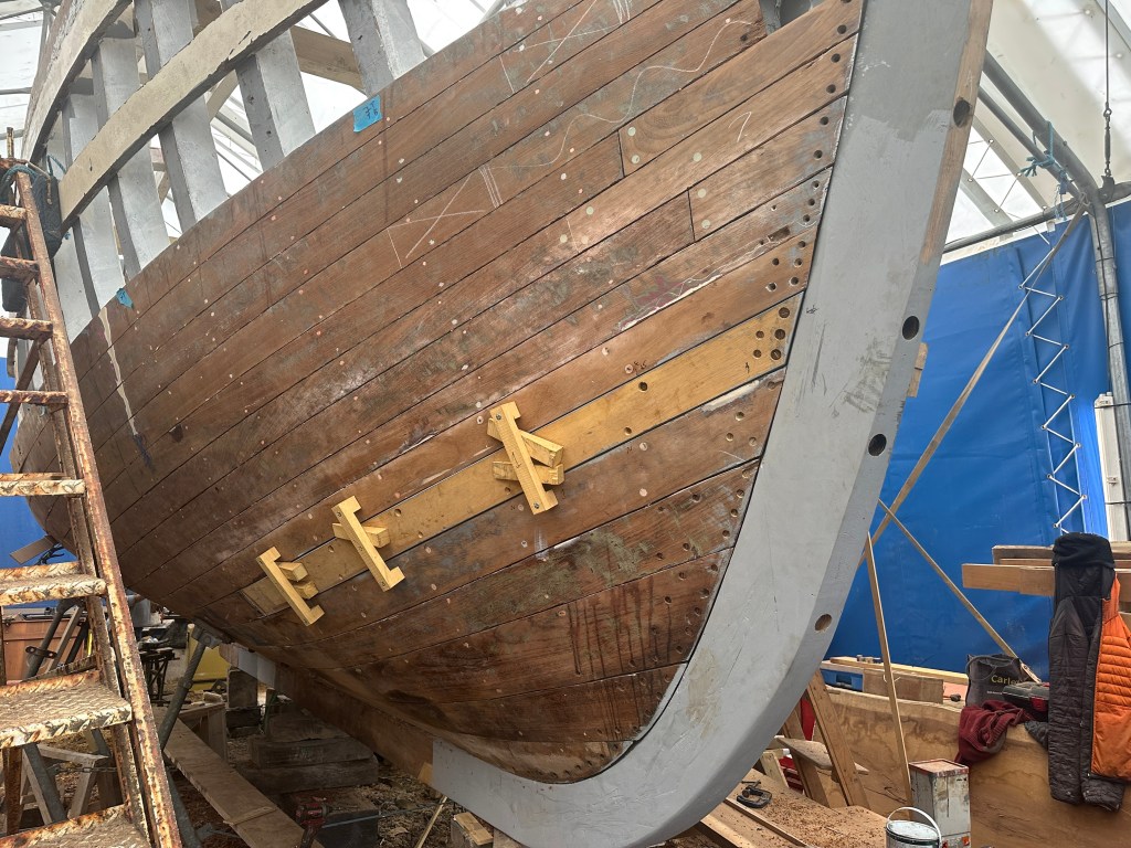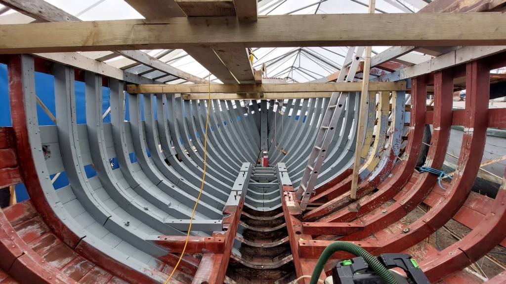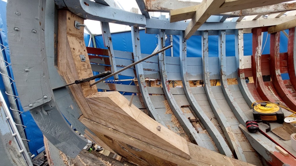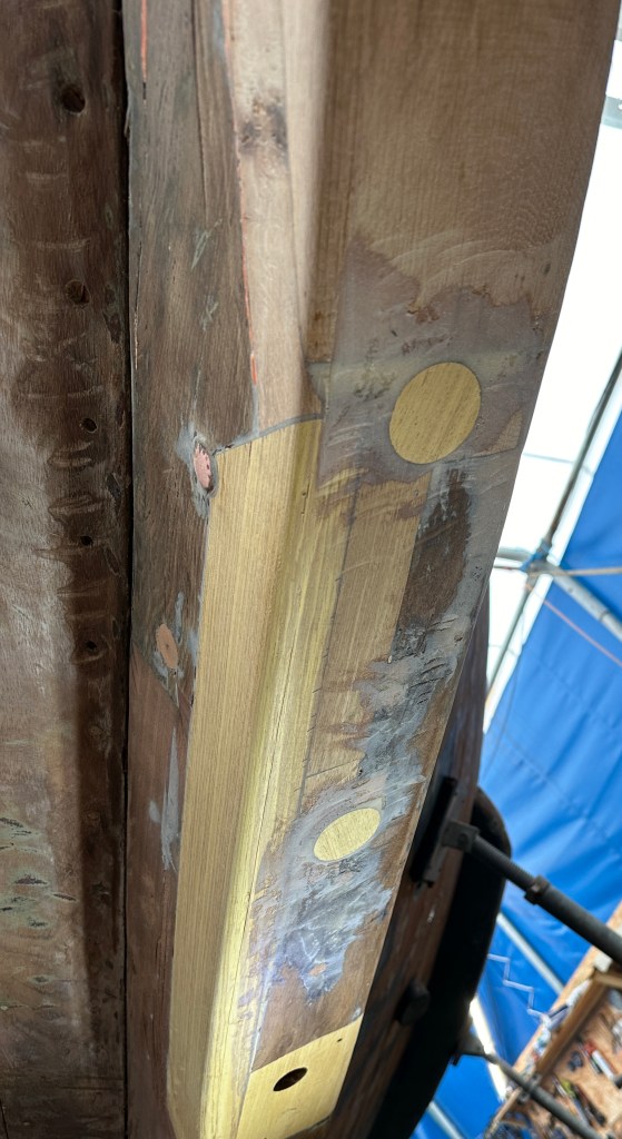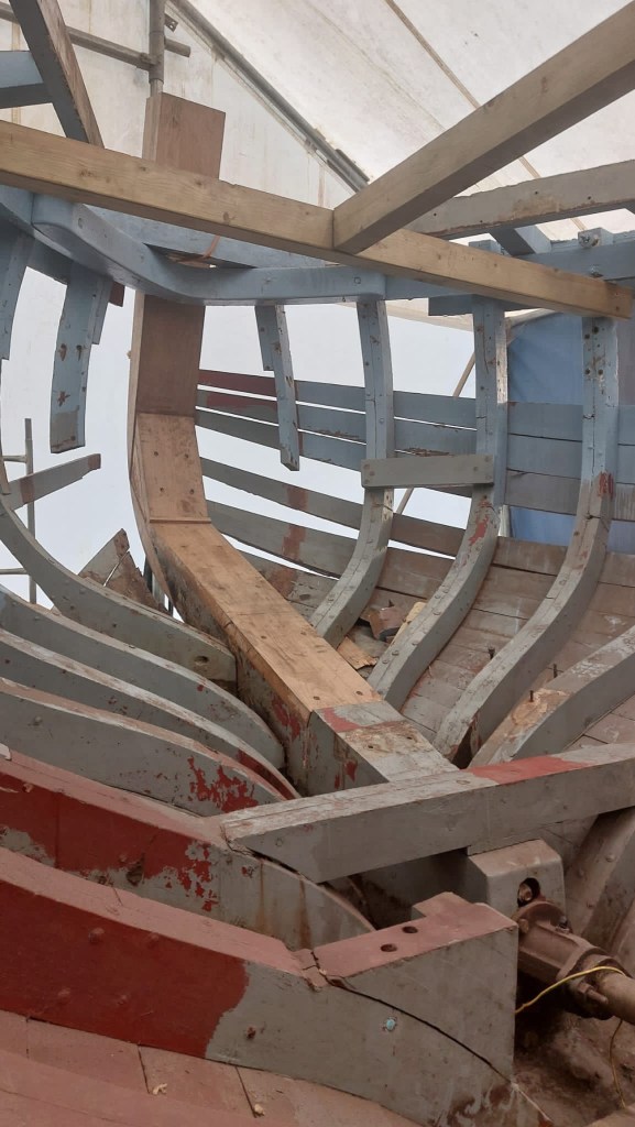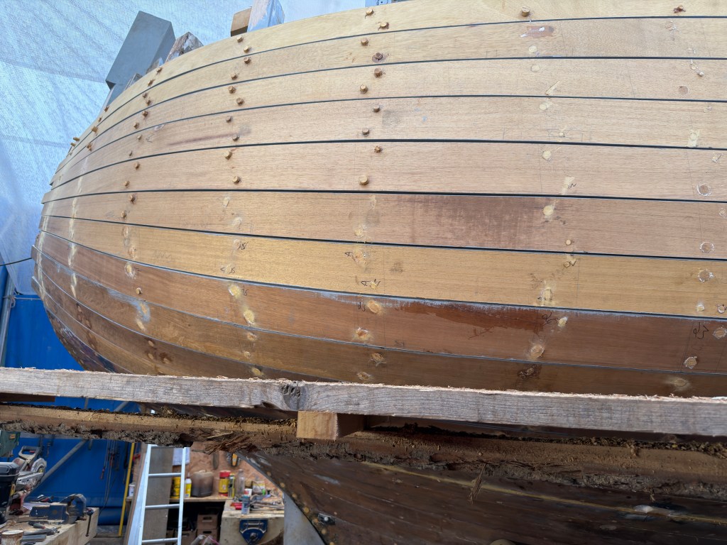 Pure art… isn’t that a beautiful stern?Caulking commences..One more plank to go!L’David fitting the first deck beams before working on the carlings …. Min 500mm around walk way.New waterline The classic vessel and design inspiration Engine repositioning aft…Sailing RigWhere shall I sleep? Reminder of the original build Port side planked up now..The planks are in two sections from 6m and 5m stock. A template is splined from the hull drawn on the stock which is cut out and the edges faired for a tight fit and bevel for caulking.James is working by himself now and getting a plank completed in 2-3 days These aft stern planks are steamed in.Preparing and fairing the frames… L’David back for October… a great opportunity to explore the coastal pubs of the Lizard!This plank had to be replaced again as the scarf needed to be further backJames Pardoe joined the permanent team in October working with L’David.Forward plank scarfed and srew fastenedFirst starboard plank completed and steamed in bag for 2hrs by L’David The 30’ planking arrives… shipwright L’David back on site..Some wider 6m planks arrivingPlanking being ripped from the Iroka treeFrames and centreline repainting by “Dot”L’David’s stern knee The new stem being fitted by SimonAn extensive and deep keel repair with half repaired internally retaining the port face and the starboard side infilled with Iroka.The first plugs fitted to the keel bolt holes.. for plug manufacture see Tool Box section.The keel and hull is being primed with an aluminium underwater wood primerSome say this is a “new build “!Boring the rudder post1/2” Oak laminate for capping the stern post I’m doing most of the frame replacement Sean…Volunteer!A lot of the original apron chunks are from oak sections which have conflicting grain and there are two long through bolts holding it all together. Big cracks on the apron face are original and we will router out a deep face to strengthen the apron before a massive 9’ long knee is laminated to hold it all together.L’David making a template for an apron lamination.It fits!Taking out the apron knee – perhaps this was added as an after thought?The Stern knee showing signs of rotThe steam and stern are winched together moving the knees internally some 10mmWe’re in good wood now..The Stem laminated from OakWe’ve bought a tree from the Congo..ethnically felled Iroka etc and planked 30’ l x 34”w x 1 5/8” thickSo here we go..!Built in the late 1960s Rosey was the largest boat built at the Cove’s shipyard and the last I believe.She was built by Edgar Cove in Salcombe Devon and launched in 1970. Built on a massive Oak backbone, frame and timber construction and planked with 1” Iroka..weighing approximately 12 ton.This is pretty much her original build condition, definitely not an effective sailing vessel but a very good steamer at 6knots, 1100rpm, 1 gal/hr come “hell or high water”!Ex works Wollgast N Germany following an extensive refit in 1998.John F Yeoman left, myself middle and Ken Painter my Dad on the right in 1985. John sadly died two years later and I lost my mentor and along with my father a great friend who supported my education in the Army before starting a 25 year career at Foster Yeoman.