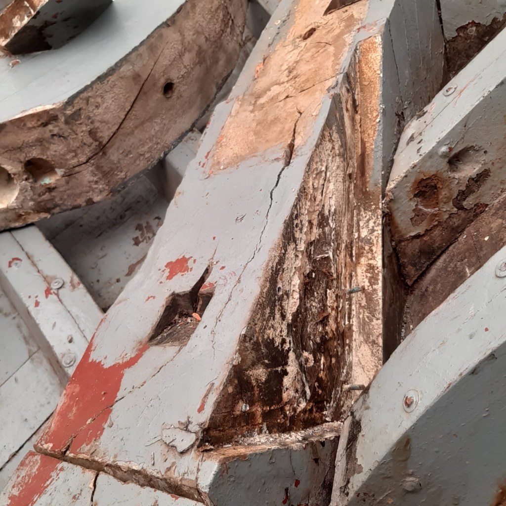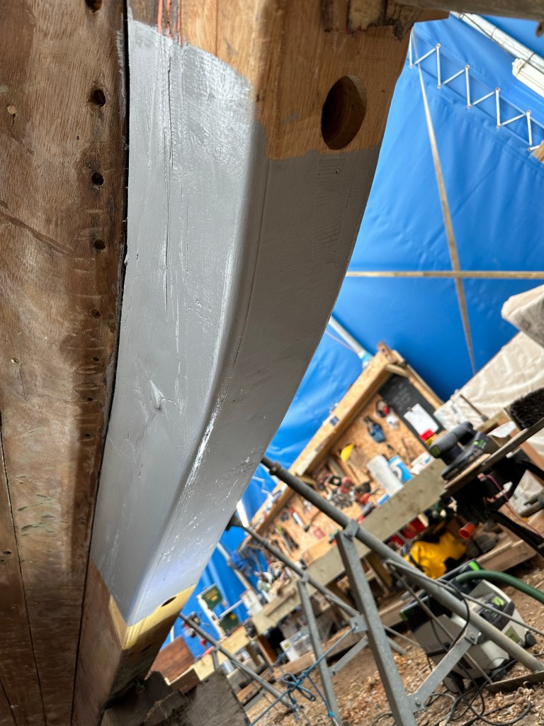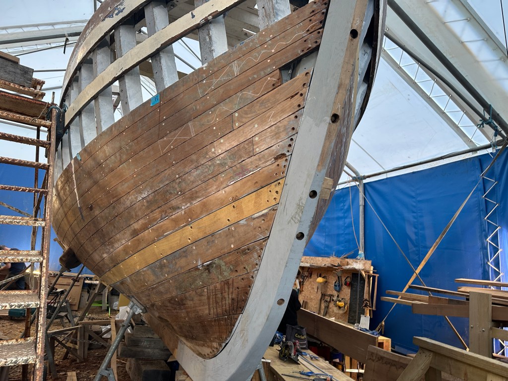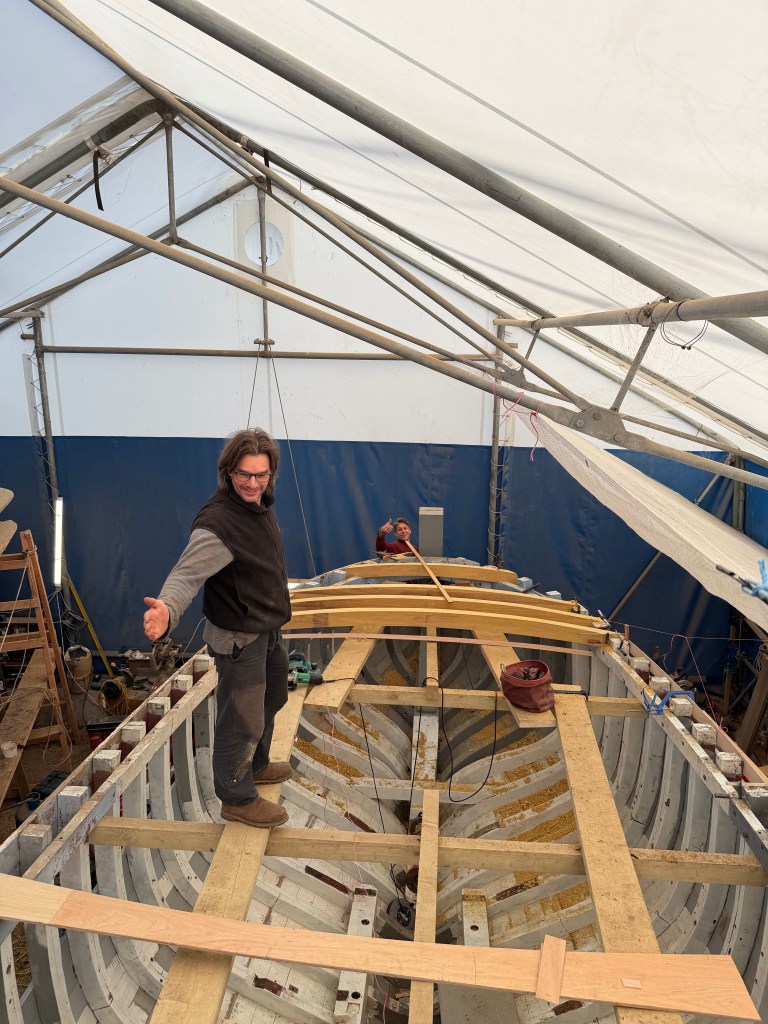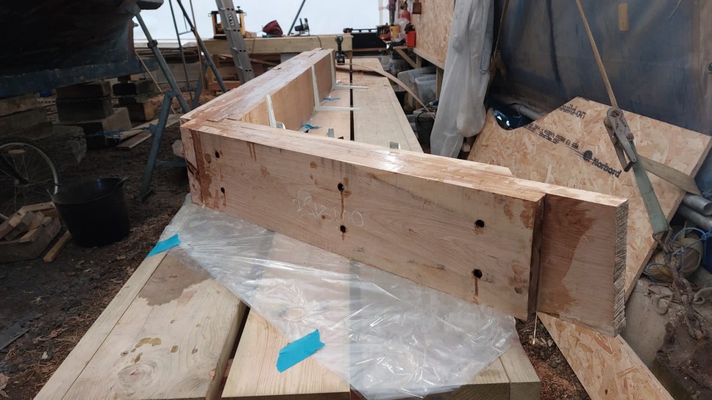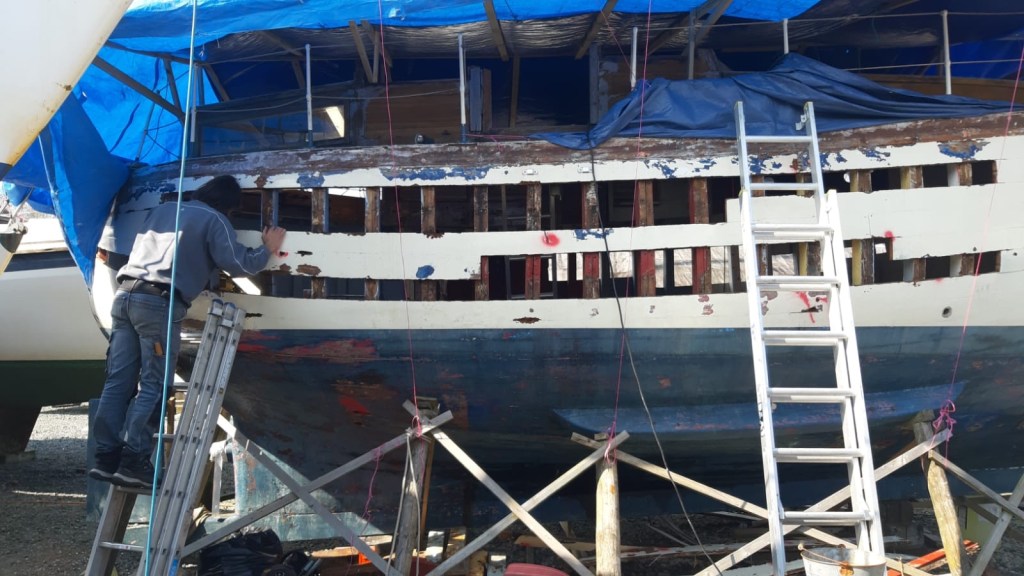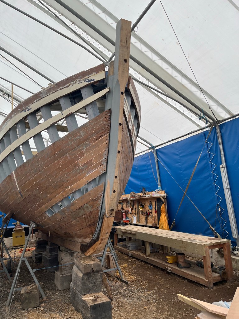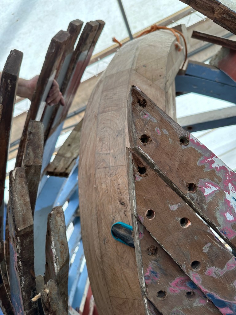 Pure art… isn’t that a beautiful stern?Caulking commences..One more plank to go!L’David fitting the first deck beams before working on the carlings …. Min 500mm around walk way.New waterline The classic vessel and design inspiration Engine repositioning aft…Sailing RigWhere shall I sleep? Reminder of the original build Port side planked up now..The planks are in two sections from 6m and 5m stock. A template is splined from the hull drawn on the stock which is cut out and the edges faired for a tight fit and bevel for caulking.James is working by himself now and getting a plank completed in 2-3 days These aft stern planks are steamed in.Preparing and fairing the frames… L’David back for October… a great opportunity to explore the coastal pubs of the Lizard!This plank had to be replaced again as the scarf needed to be further backJames Pardoe joined the permanent team in October working with L’David.Forward plank scarfed and srew fastenedFirst starboard plank completed and steamed in bag for 2hrs by L’David The 30’ planking arrives… shipwright L’David back on site..Some wider 6m planks arrivingPlanking being ripped from the Iroka treeFrames and centreline repainting by “Dot”L’David’s stern knee The new stem being fitted by SimonAn extensive and deep keel repair with half repaired internally retaining the port face and the starboard side infilled with Iroka.The first plugs fitted to the keel bolt holes.. for plug manufacture see Tool Box section.The keel and hull is being primed with an aluminium underwater wood primerSome say this is a “new build “!Boring the rudder post1/2” Oak laminate for capping the stern post I’m doing most of the frame replacement Sean…Volunteer!A lot of the original apron chunks are from oak sections which have conflicting grain and there are two long through bolts holding it all together. Big cracks on the apron face are original and we will router out a deep face to strengthen the apron before a massive 9’ long knee is laminated to hold it all together.L’David making a template for an apron lamination.It fits!Taking out the apron knee – perhaps this was added as an after thought?The Stern knee showing signs of rotThe steam and stern are winched together moving the knees internally some 10mmWe’re in good wood now..The Stem laminated from OakWe’ve bought a tree from the Congo..ethnically felled Iroka etc and planked 30’ l x 34”w x 1 5/8” thickSo here we go..!Built in the late 1960s Rosey was the largest boat built at the Cove’s shipyard and the last I believe.She was built by Edgar Cove in Salcombe Devon and launched in 1970. Built on a massive Oak backbone, frame and timber construction and planked with 1” Iroka..weighing approximately 12 ton.This is pretty much her original build condition, definitely not an effective sailing vessel but a very good steamer at 6knots, 1100rpm, 1 gal/hr come “hell or high water”!Ex works Wollgast N Germany following an extensive refit in 1998.John F Yeoman left, myself middle and Ken Painter my Dad on the right in 1985. John sadly died two years later and I lost my mentor and along with my father a great friend who supported my education in the Army before starting a 25 year career at Foster Yeoman.
